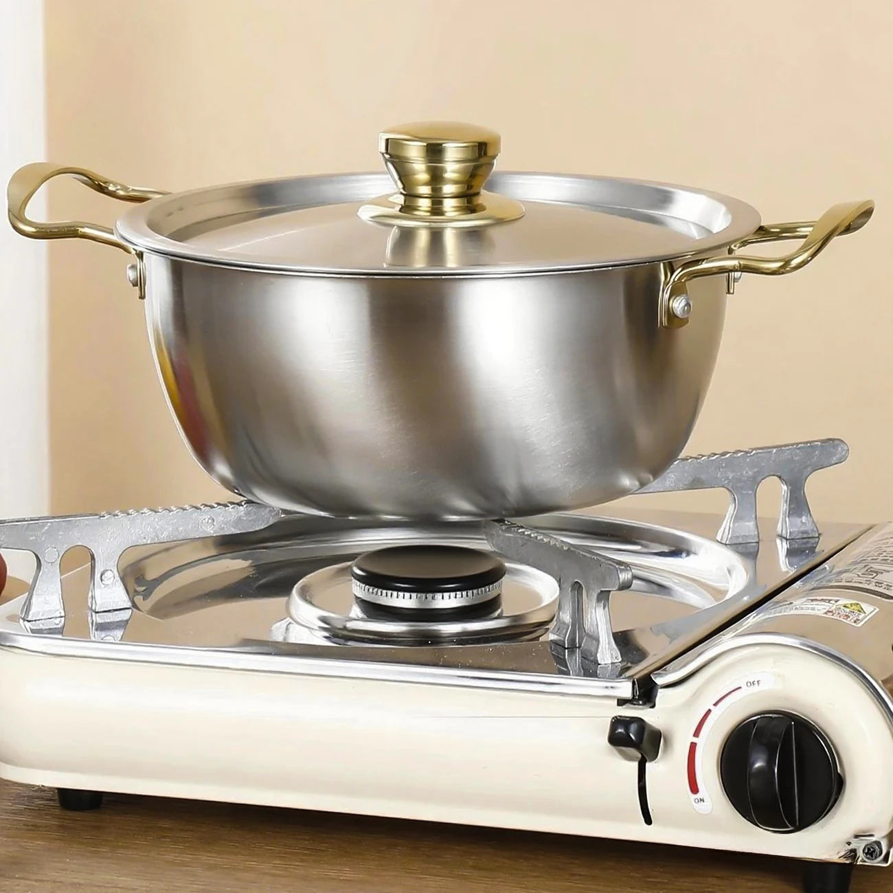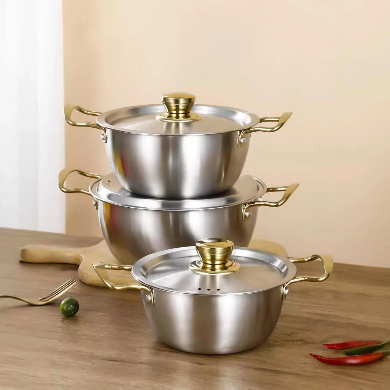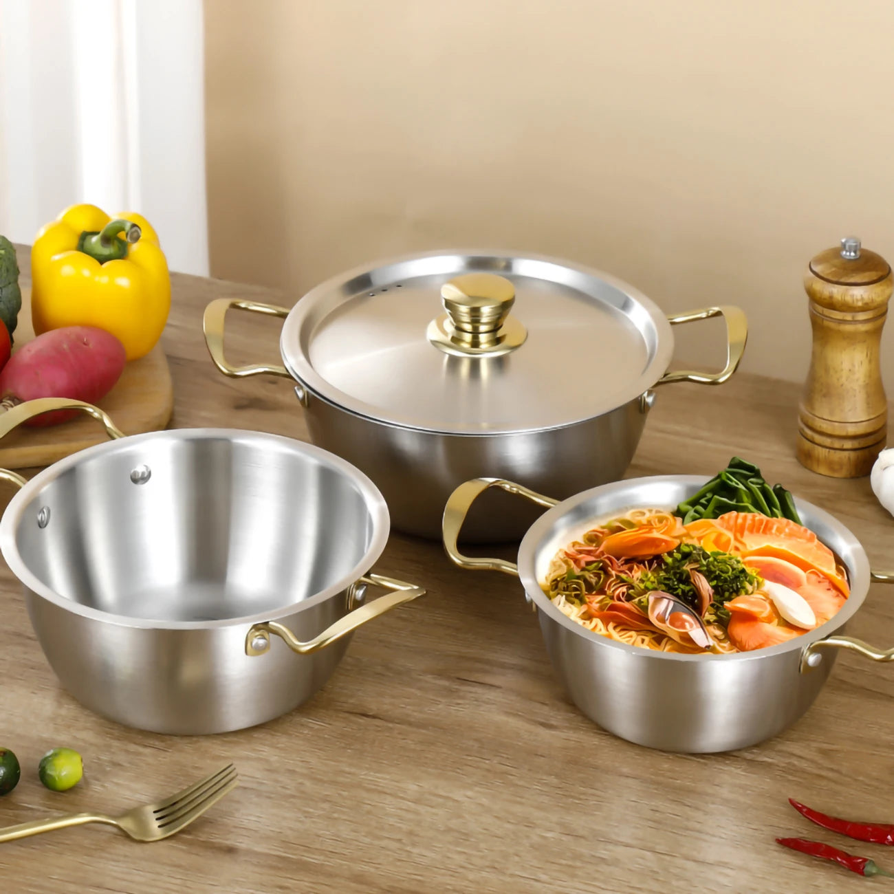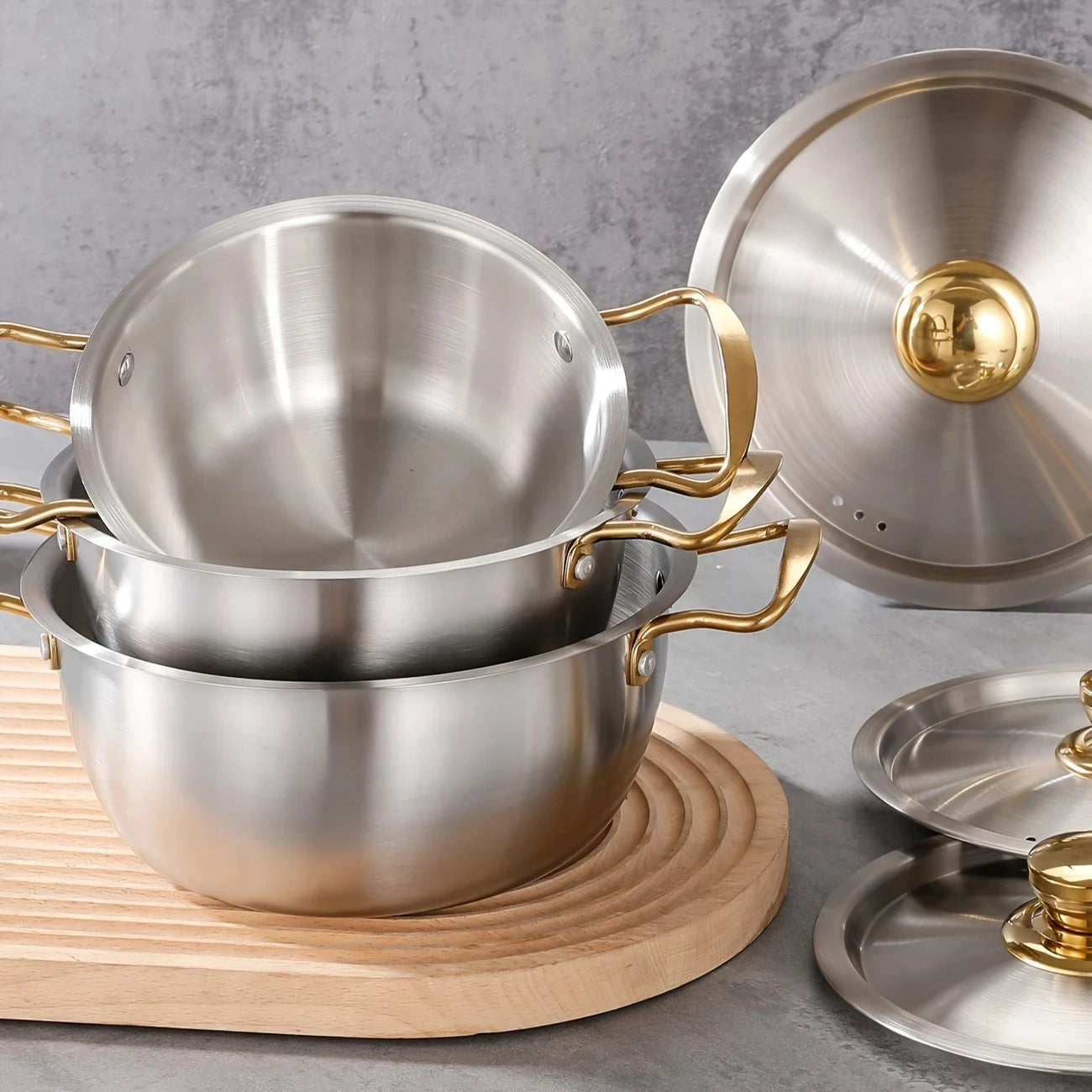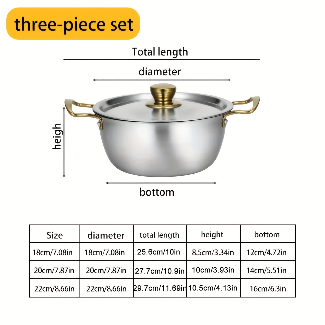 Set di pentole in acciaio inossidabile da tre pezzi, 18/20/22 cm, pentola coreana a doppia estremità, pentola giapponese con doppi manici, resistente Ki