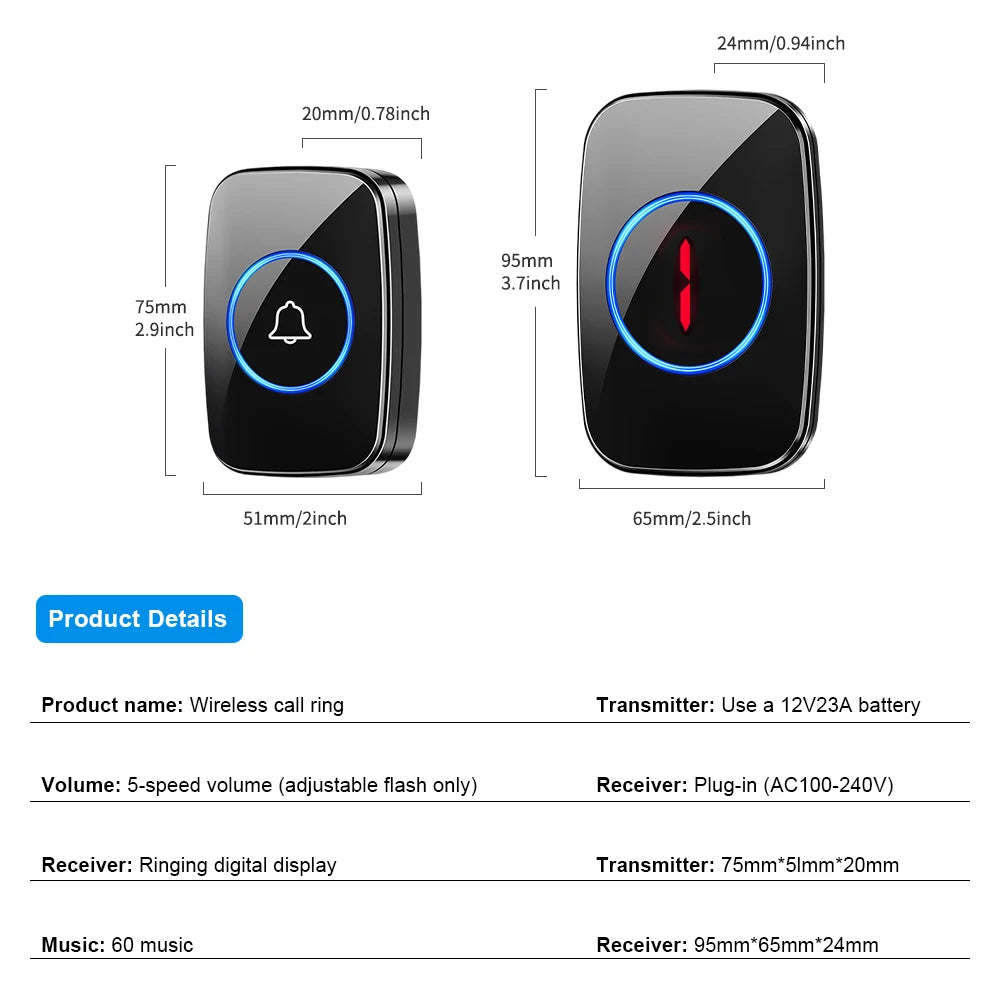 Campanello wireless con display digitale, campanello per casa intelligente, 60 brani, 5 volumi, promemoria di chiamata, adatto per ville familiari, negozi, ecc.